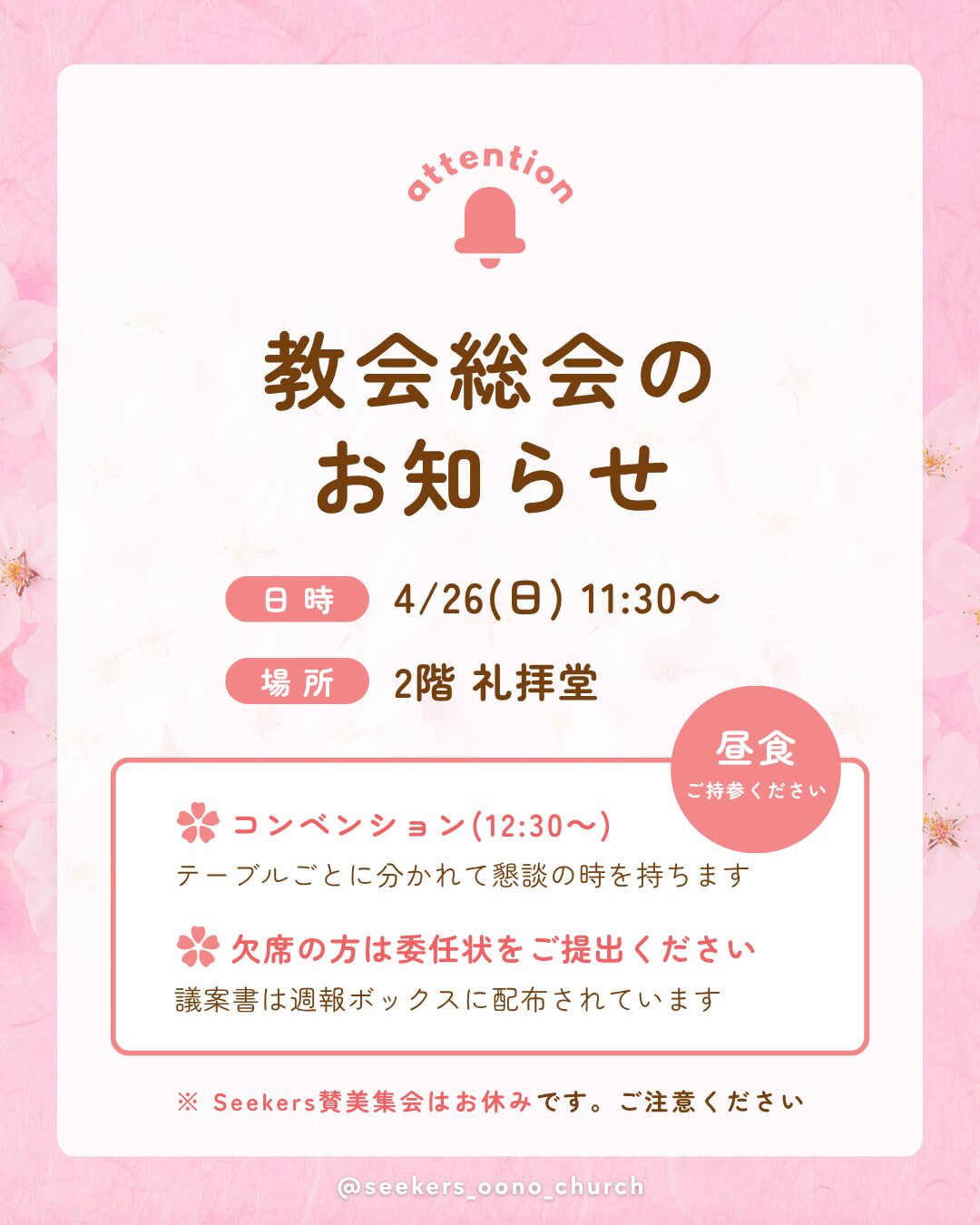 ※やむを得ず出席できない方は、委任状を4/26(日)11時までに必ずご提出ください。総会資料は週報ボックスに配布されています。